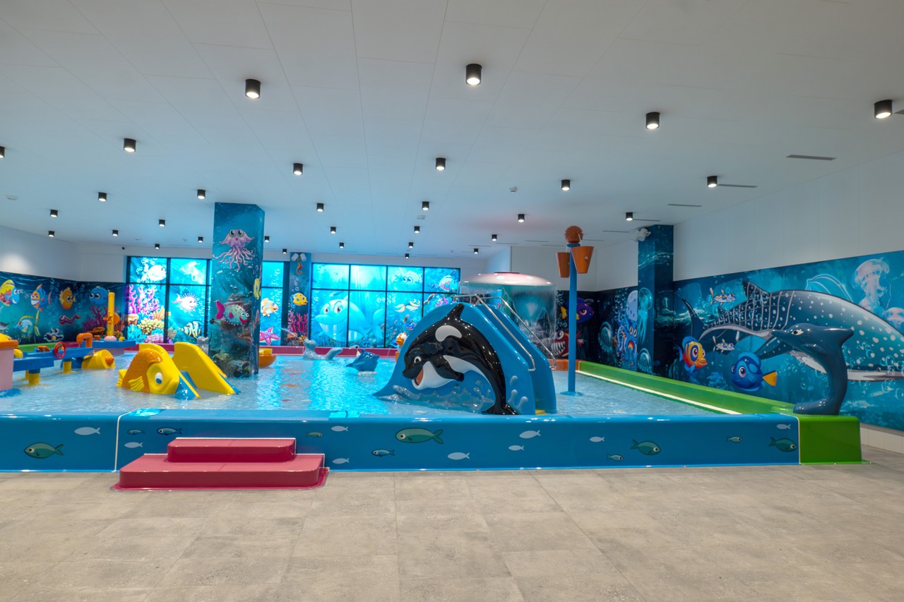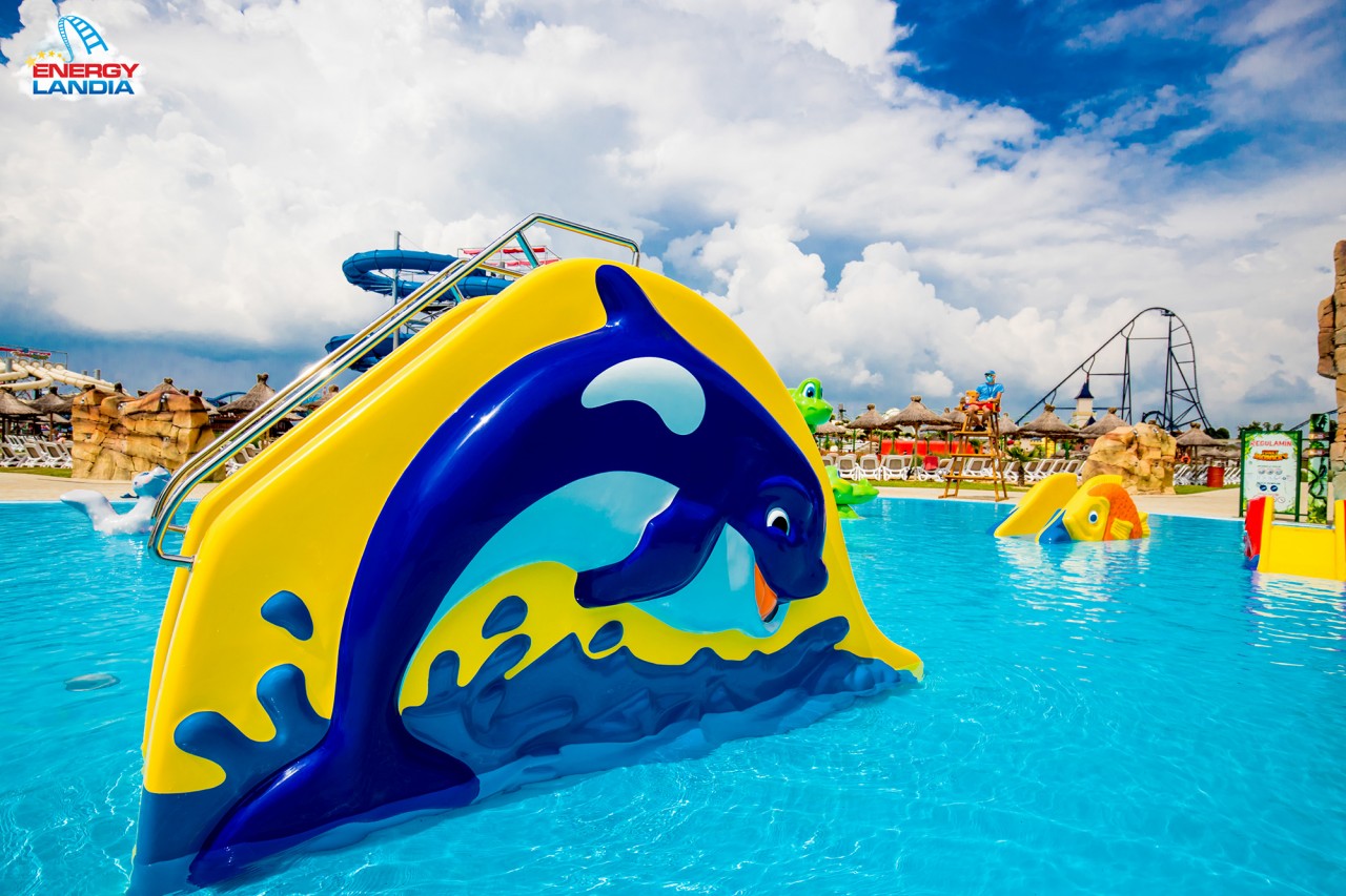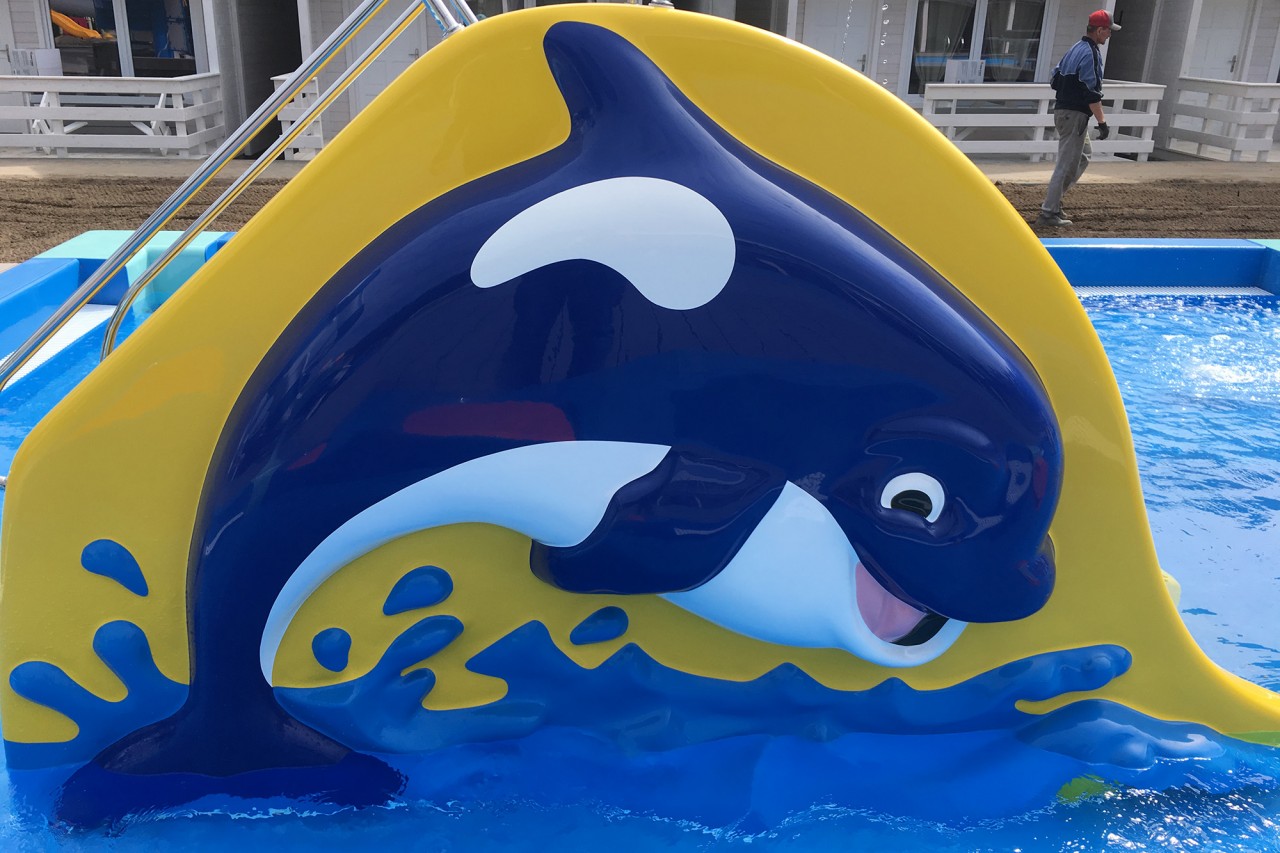 Orca Slide is available in any color. It can be installed directly in the pool or on the splashpad. It is one of the most popular waterslides for the youngest kids in our offer.